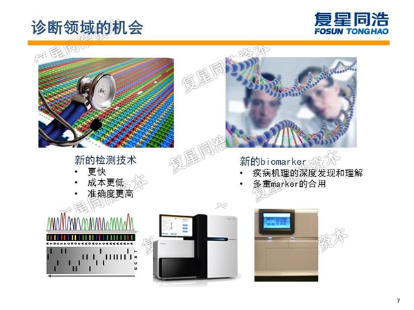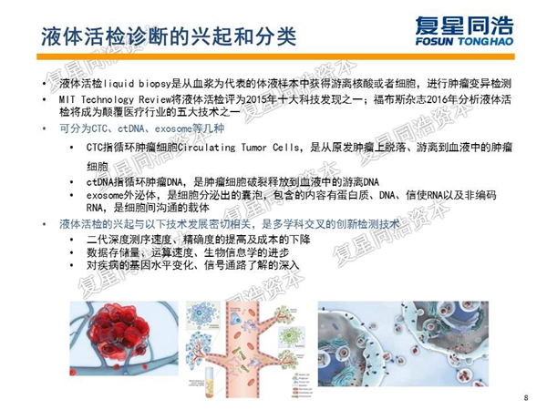 第一个方向是检测技术,我们必须关注速度更快、更便宜、更准确的检测技术。虽然二代测序已经很低了,但一定有更低成本的第三代测序和第四代测序技术。 这张PPT下面的三张图,左数第一张就是第一代测序桑格尔测序,桑格尔是非常伟大的化学家和生物学家,一生中获得了两次诺贝尔奖,这个测序技术是保证人类基因组计划完成的重要技术之一。左数第二张图是二代测序仪,第三张图号称是第三代测序仪,我们希望有更多的创新测序技术和产品出现。 除了测序技术本身,我们还希望在新的疾病领域发现更多的生物标记物(Biomarker)。以HER2和乳腺癌为例,只有发现了疾病机理才能对症下药。现在发现的Biomarker很少,我们对疾病还没有完全了解。 在诊断领域,液体活检是被行业特别看好的技术。液体活检技术(Liquid biopsy)是从以血液为代表的体液中获得游离核酸或者细胞进行突变检测。液体活检在技术被认为是2015年的十大科技发现之一,在商业上也被认为是有可能颠覆医疗行业的应用。
