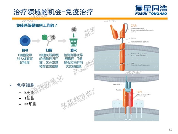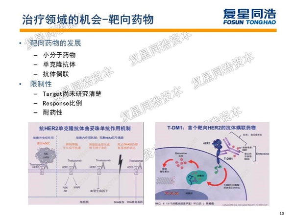 先诊断后治疗,如果诊断出来哪些基因发生了突变,在治疗领域现在有什么样的方案?治疗领域里的机会第一个是靶向药物。 靶向药物既有机会,也有限制。限制性来说是因为我们对疾病基理没有完全了解,只发现一小部分,比如说乳腺癌20%-30%是HER2突变的,其他的还不清楚,怎么办?疾病机理还没有研究清楚,用完药以后反应比例也不一样。 还是以HER2为例,如果发现肿瘤患者有HER2的突变,专门针对此类乳腺癌患者的药物叫赫赛汀。这个药从上市开始到现在每年的销售额在十几亿美金以上,它会抑制掉肿瘤后面的信号通路,从而抑制肿瘤的发展。但赫赛汀用了一段时间后还会出现耐药性,再用赛汀以后也不会有多大的效果。 现在有一种方案叫抗体偶联,抗肿瘤抗体通过化学修饰与效应分子偶联,这些偶联物既有特异性识别肿瘤抗原的能力,也保留了相应分子杀伤肿瘤细胞的毒性,可定向地浓聚到肿瘤部位,选择性杀伤肿瘤细胞。比如在HER2抗体上面再联个T-DM1,它可以和HER2的抗体到达肿瘤的位点,杀死肿瘤。 靶向药物的发展方向有三个,一个是小分子药物,另外一个是大分子的药物生物药物(单克隆抗体),还有一个是抗体偶联等新技术。 7利用提升人体自身的免疫能力治疗癌症的免疫疗法