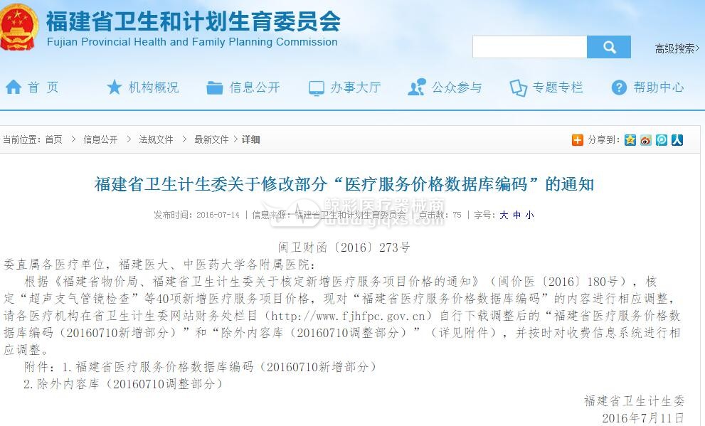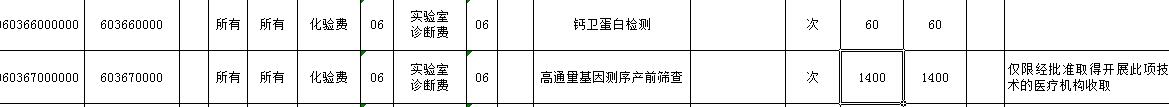 福建省卫生计生委关于修改部分“医疗服务价格数据库编码”的通知 委直属各医疗单位,福建医大、中医药大学各附属医院: 根据《福建省物价局、福建省卫生计生委关于核定新增医疗服务项目价格的通知》(闽价医〔2016〕180号),核定“超声支气管镜检查”等40项新增医疗服务项目价格,现对“福建省医疗服务价格数据库编码”的内容进行相应调整,请各医疗机构在省卫生计生委网站财务处栏目(http://www.fjhfpc.gov.cn)自行下载调整后的“福建省医疗服务价格数据库编码(20160710新增部分)”和“除外内容库(20160710调整部分)”(详见附件),并按时对收费信息系统进行相应调整。 福建省卫生计生委 2016年7月11日 以上内容来源于湖南省卫计委 下面让我们看一看全国各省市关于NIPT的相应政策: 1、深圳市NIPT纳入医保 2016年1月23日,广东省深圳市卫计委副主任率先发声,建议将孕妇无创产前基因检测纳入医保。据深圳晚报报道,深圳市卫计委副主任许四虎建议,将孕妇无创产前基因检测、孕妇地中海贫血基因检测、新生儿遗传性耳聋基因检测在全省范围内纳入医疗保险进行筛查。 悉知,“无创产前基因检测”已于2013年纳入了深圳市社保生育保险范畴,生育保险参保人接受无创产前基因检测的,由生育保险基因每人每次支付400元即可。 2、湖北省NIPT定价1460元/次 据湖北省人民政府官方网站报道,湖北省于4月1日正式启动实施高通量基因测序产前筛查工作,未来湖北将实现“无唐氏综合症”。湖北省物价局、省卫生计生委联合发布了《关于胎儿染色体非整倍体基因检测项目价格有关问题的通知》,明确了检测收费标准为1460元/次,检测费用较以前相比有了大幅度降低。 3、江苏物价局NIPT定价价2210元/次 2015年8月7日,江苏省物价局、江苏省卫生和计划生育委员会、江苏省人力资源和社会保障厅联合出台《核定部分医疗服务项目价格的通知》。通知依据《江苏省新增医疗服务项目价格管理办法》、《关于新增和完善医疗服务价格项目的通知》,经过成本审核,对部分医疗服务项目及价格进行了制定和完善。其中,将胎儿软色体非整倍体无创基因检测划分为丙类收费等级,规定每次检测2210元的收费标准。 4、重庆市NIPT纳入医保 2016年1月23日,重庆建议将孕妇无创产前基因检测纳入医保。据报道,重庆将孕妇无创产前基因检测、孕妇地中海贫血基因检测、新生儿遗传性耳聋基因检测在全省范围内纳入医疗保险进行筛查。 5、四川发改委定价NIPT定价2400元/次 据川发改价格[2015]350号文件,四川省发展和改革委员会、四川省卫生和计划生育委员会就四川大学华西第二医院《关于我院高通量基因测序产前筛查与诊断技术项目收费的请示》(华西二院[2015]7号)做出了批复,并联合出台《关于“高通量基因测序产前筛查与诊断技术”项目收费标准的复批》的文件,对“高通量基因测序产前筛查与诊断技术”收费标准定为2400元/次。 6、贵州省高龄单独两孩孕产妇出生缺陷基因筛查享受全免费政策 2015年9月22日,贵州省人民政府印发了《支持基因检测技术应用政策措施(试行)》,为了推动基因测序普及,贵州政策探索多元化付费机制,总结黔西南州兴义市无创产前基因检测、新生儿耳聋基因检测、妇女宫颈癌(HPV)筛查试点经验,探索建立财政补贴、医保报销和个人自付共同承担的基因检测付费机制,适时向全省推广。加快推动治疗药物基因检测、罕见病基因检测按规定纳入医保支付范围。高龄单独两孩孕产妇唐氏综合征等出生缺陷基因筛查享受全免费政策。然而,此次贵州省规定的是高龄单独两孩孕产妇进行新生儿出生缺陷基因筛查可享受全免政策,并为对所有孕产妇的无创产前基因检测进行规定。 7、湖南省:计划生育特殊家庭可享免费产前诊断,但未对孕妇无创产前基因检测纳入医保进行规定 2015年8月28日,湖南省人民政府印发了关于《湖南省促进基因检测技术应用若干政策(试行)》的通知,湖南政府鼓励有条件的地区针对新生儿遗传性耳聋、唐氏综合征等遗传性疾病进行基因检测筛查,在遵循知情、自愿、保密的原则下,以政府采购的方式开展和推广;选择一批试点地区开展基因检测技术应用专项行动,针对曾生育智力障碍患儿或夫妇之一系智力障碍患者的对象,且现无存活子女的计划生育特殊家庭,由省政府专项基金和指定有资质的医疗机构共同出资,免费开展“先证者诊断”及产前诊断服务,降低出生缺陷儿的出生概率。 另外:2015年7月9日,瑞士联邦民政部门(EDI)宣布:从7月15日开始,将为有高危染色体异常风险的孕妇提供强制性医疗保险(OKP),免费提供NIPT检测(无创产前诊断)。2016年1月14日,英国国家筛选委员会推荐英国各大医院使用NIPT,英国国家卫生部长建议在未来几个月中将NIPT用于孕妇胎儿唐氏风险的筛查,并考虑将NIPT筛查唐氏综合征纳入英国国民健康保险制度。