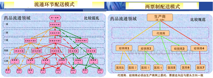很明显,这是对4月26日发布的国务院26号文的进一步“加码”。在26号文中,曾明确要在11个医改试点省份和200个试点城市推广“两票制”,该范围占全国333个地级市的60%。 如今,药品的“两票制”福建省已经表态,江苏省已出台征询意见稿;医用耗材的“两票制”已经率先在广东惠州落地,宁夏、陕西也相继出台落实文件。 毋庸置疑,随着时间的推移,更多医改试点省份和城市会进一步落实“两票制”。 什么催生了“两票制”? 所谓“两票制”是指药品从药厂卖到一级经销商开一次发票,经销商卖到医院再开一次发票。不难看出,其出台背景正是剑指挂靠过票、层层盘剥的行业潜规则。 在我国,药品、医疗试剂耗材进医院一般包括的途径有:(1)集中采购平台;(2)药剂科特批(临床医生、各科门诊大夫提出药品使用申请单交到药剂科,批准签字后交到主任、院长,经药事委员会讨论后决定是否批准);(3)厂家通过各地的经销商配往医院;(4)厂家直接对接医院投放设备相关的试剂。