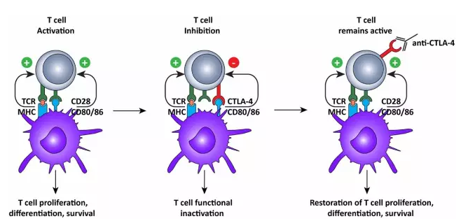 免疫学,尤其是T细胞,是James Allison博士一生的研究,而癌症治疗只是在晚些时候才进入了他的生活。“我之所以投身于癌症研究,是由于我数位亲人因为癌症而失去生命,”他说道:“我的母亲和两个舅舅,以及我自己的兄弟,都没能逃过癌症这一劫。” 当他的兄弟因患前列腺癌去世时,James Allison也被诊断患有该病。不过,他幸运地活了过来。“治疗在我身上起了效果,”他半开玩笑地说道:“相比于前列腺癌,我也许更可能由于懒得运动而死。” 上世纪90年代,James Allison博士和Jeffrey Bluestone博士各自独立完成一项具有里程碑意义的重大发现:一个曾经被认为具有免疫激活作用的分子实际上抑制了免疫反应。这就是位于T细胞表面的一种蛋白质CTLA-4——我们现在所致的免疫检验点——属于T细胞固有的自我约束机制,以免反应过度并伤害到健康组织。癌细胞有时会“假装认识”CTLA-4,然后结合上去,从而抑制T细胞的抗肿瘤活性。 James Allison博士由此思考,是否可能通过阻断检验点从而激发T细胞的抗癌活性。于是,他和自己实验室的博士后Dana Leach共同开发出了一种可阻断该检验点的CTLA-4抗体。当他们把这种抗体输入患癌小鼠体内后,肿瘤竟然消失了!