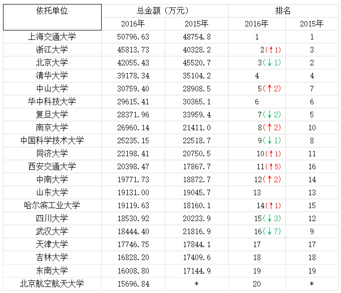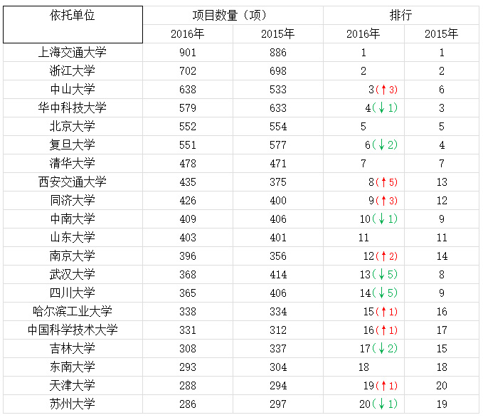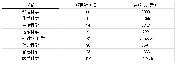 由表1可看出,一方面,国家正加大力度提升较不发达地区科研机构完成项目的能力和动力,因此增加了地区科学基金项目的数量;另一方面,国家对青年科学项目的水平和要求已经提高。结合历史数据,基金总项数和基金总金额依然呈正相关。地区科研基金项目多分布在甘肃、广西、贵州、广西、云南等地区,其原因来自制度保护;其他种类基金都分布在高等院校和科研单位比较多的地区,比如北京、上海、广东等经济较发达的城市。 单项之最 表2 单项资助金额1000万以上项目统计表 数额之最 2016年的受自然科学基金资助最多的单位依然是上海交通大学,总项目数901项,单项资助金额从4万元到1050万元不等,平均56.32万元。表3按学部对其项目进行分类,可见上海交大在医学科学领域拥有较大优势。 表3 上海交通大学自然科学基金项目学部分类表