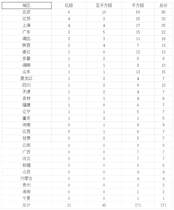 地区之最 从表4中单一机构获得千万元以上资助的地区分类来看,排在前五位的仍旧是北京、江苏、上海、广州、湖北,与总体数据流一致。其中,北京市科研机构所获项目资金近38亿元,约占项目金额总数的20.8%,超过末尾18个省市区之和,而青海和西藏没有单一机构获得千万以上资助,这和当地重点科研机构稀缺以及环境恶劣有关。 表4 2016年单个机构获得千万元以上资助地区统计表(单位:个)
