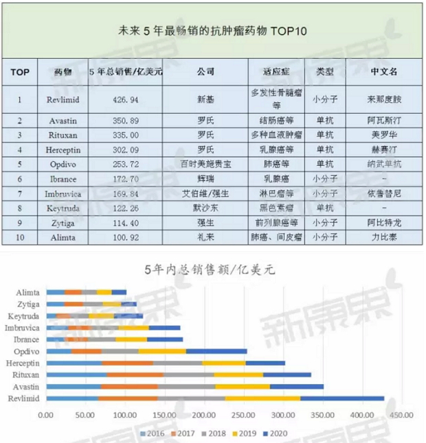 随着肿瘤患者逐年增加,抗肿瘤药物市场也成为近年来医药界关注热点。最新统计显示,全球最畅销的100个药物中抗肿瘤药物有20个。下面来盘点一下未来5年最畅销抗肿瘤药物TOP10,其中既有风骚多年的罗氏三巨头单抗,有持续坚挺的来那度胺,有新型靶向小分子抗癌药物,更有近年来异军突起的PD1抑制剂类药物。![]() ![]() TOP1 Revlimid 来那度胺 来那度胺是新基(Celgene)开发的新一代抗肿瘤药,主要用于治疗骨髓增生异常综合症和多发性骨髓瘤。它的治疗效果那度胺已获得全球范围内医生和患者的广泛认可。 今年7月份欧盟委员会批准Revlimid用于治疗复发或者难治的套细胞淋巴瘤,FDA批准用于治疗复发或者至少接受过两次治疗的套细胞淋巴瘤;7月份Revlimid用于一线治疗弥散性大B细胞淋巴瘤的III期临床研究也已经结束,其适应症范围将进一步扩大。 来那度胺上市后增长迅速,2015年销售额达58亿美元,而2016年上半年达32.74亿美元,预计2016年销售额将到68亿美元,到2020年它有望成为首个销售额超过百亿美元的抗肿瘤药物,是当之无愧的未来5年最畅销抗肿瘤药物TOP1。 值得一提的是,国内双鹭制药的来那度胺于2016年4月被CFDA纳入优先审批程序,一旦获得批准就表示双鹭的来那度胺成功打破新基来那度胺专利壁垒。 TOP2 Avastin 阿瓦斯汀 阿瓦斯汀作为一种抗血管生成的药物,通过抑制血管内皮生长因子的作用阻断肿瘤,抑制肿瘤在体内扩散,增强化疗疗效。在批准用于治疗乳腺癌前,这种药物还被美国药管局批准用于治疗肺癌、结肠癌和直肠癌,并在欧洲获准用于治疗乳腺癌、结肠癌和直肠癌。相对于赫赛汀和美罗华,阿瓦斯卡面对的生物仿制药竞争不是很大,前二者在欧洲的专利都已到期,而阿瓦斯汀可以被保护到2022年。2016上半年年销售额为35.74亿美元,同比增长了4%,预计未来几年还有一定的上涨空间。 TOP3 Rituxan 美罗华 美罗华是一种抗CD20单克隆抗体,适应症广泛,用于治疗各种血液肿瘤,还可用于二线治疗类风湿性关节炎,它已连续多年蝉联抗肿瘤药物销售冠军的宝座,不过今年应该就是它的销售巅峰了。此药专利在美国将于2016年9月22日到期,一大波仿制药一旦袭来,美罗华的销量势必会大大下跌。罗氏为此推出了一款新药Gazyva来应对生物仿制药的挑战,今年6月罗氏发布了Gazyva针对滤泡性淋巴瘤最新头对头临床试验结果,显示与美罗华相比,Gazyva能够显著延长既往未接受过治疗的滤泡性淋巴瘤患者的无进展生存期,达到了III期临床试验Gallium的主要终点。2016年上半年销售额为38.28亿美元,同比上升了5%。 TOP4 Herceptin 赫赛汀 赫赛汀是治疗HER2阳性弥散性乳腺癌的黄金标准,最近几年的年销售额一直维持在60亿美元以上,但增长空间有限,市场已达到饱和,美国专利将于2019年到期。就此,罗氏推出了取代赫赛汀的药物——Perjeta,用于抵抗生物仿制药的竞争,但临床研究结果表明Perjeta对HER2阳性的乳腺癌治疗效果并不比赫赛汀优秀,其增长潜力并未达到预期效果。赫赛汀2016年上半年销售额为35.51亿美元,同比增长5%。预计2017年后受仿制药竞争影响,将出现销量下滑。 TOP5 Opdivo 纳武单抗 Opdivo 是百时美施贵宝推出的一款新型的PD-1抑制剂类靶向抗肿瘤药物,是被各路人士看好的一款重磅药物。从2014年以来,它被批准上市的适应症已经多达4个,分别是复发难治的经典型霍奇金淋巴瘤;二线治疗不可切除的黑色素瘤;二线治疗非小细胞肺癌;已经晚期或者转移的肾细胞癌。另外还在两个适应症上获得突破性治疗药物资格:头颈部鳞状细胞癌和尿路上皮癌。Opdivo广泛被认为在竞争激烈的PD-1抑制剂类新型抗肿瘤药物中处于领先地位。而它的销售额也证明了这一点,自2014年上市后销售额直线上升,今年上半年销售额为15.44亿美元,几乎是去年同期的10倍,预测到2022年时其峰值年销售额或将超过100亿美元。 TOP6 Ibrance Ibrance 是辉瑞研发的一种口服性抗CDK抑制剂,可用于治疗各种癌症,它是全球首个CDK4/8抑制剂。2015 年 2 月 3 日,FDA批准Ibrance用于一线治疗 ER+/HER2- 绝经后晚期乳腺癌;2016年4月,FDA批准Ibrance用于二线治疗治疗ER+/HER2- 绝经后晚期乳腺癌,此次获批将显著扩大Ibrance的患者群体。2016年1月Ibrance被英国药品与健康产业管理局(MHRA )授予“重大创新新药”资格,这意味着Ibrance离进入英国药物快速审批通道EAMS更近了一步,进入英国市场也指日可待。业界对Ibrance的商业前景也十分看好。此前,全球医药行业调研机构GlobalData发布报告指出,辉瑞CDK4/6抑制剂Ibrance将主导HR+乳腺癌。2015年Ibrance 销售量达14.43亿美元,2016年上半年为9.42亿美元,预计销售峰值将超过50亿美元。 TOP7 Imbruvica 依鲁替尼 依鲁替尼是一款新型的BTK酶抑制剂,是由强生和艾伯维共同研发,已被FDA批准用于治疗套细胞淋巴瘤、慢性淋巴细胞白血病、非霍奇金淋巴瘤等,6月份被欧盟批准用于治疗慢性淋巴细胞白血病。处于后期临床研究的适应症包括:弥漫性大B细胞淋巴瘤、滤泡性淋巴瘤、胰腺癌。艾伯维和强生对此药及其乐观,称Imbruvica的年销售峰值可望达到115-120亿美元,这虽然有点过于夸张,但依鲁替尼表现确实强劲,2015年销售为14.43亿美元,2016年上半年销售额已达到13.76亿美元。观察家们预期此药销售峰值可达50亿美元。 TOP8 Keytruda Keytruda是默沙东推出的一款抗PD1单克隆抗体,也是BMS的Opdivo强有力对手,二者在PD1抑制剂市场上的竞争也颇有看点