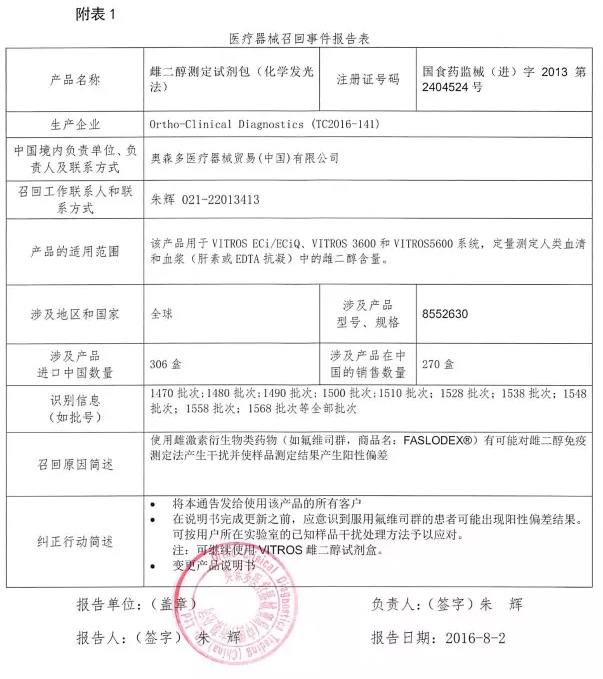 8月2日,奥森多医疗器械贸易(中国)有限公司报告,对注册证号码为国食药监械(进)字2013第2404524的雌二醇测定试剂包(化学发光法)实施主动召回,设计产品在中国销量270盒。