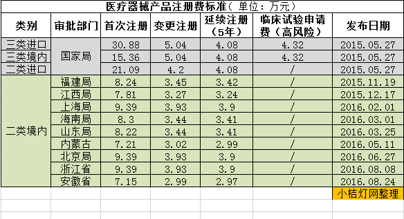 小桔灯网整理目前全国及各地医疗器械注册收费情况一览