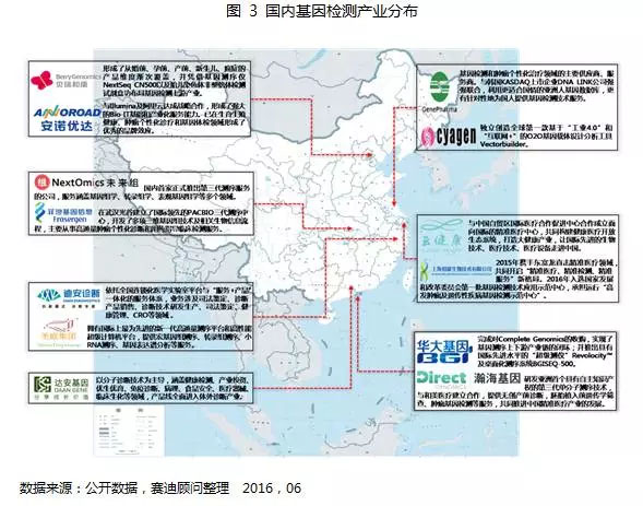 基因检测应用领域不断扩大,逐渐形成检测服务全面发展态势。基因检测服务机构业务范围不断扩大,业务覆盖了全国二十多个省市。北京、广州拥有华大基因、贝瑞和康、安达基因等众多的基因检测领军企业,加之众多高等教育机构以及专业人才的支持,基因检测水平全国领先。2014年12月,国家卫计委医政医管局公布第一批高通量基因测序技术临床应用试点名单,其中北京6所、广东3所、湖南2所;2015年1月,卫计委医政医管局再次发布基因测序产前筛查与诊断临床应用试点名单,其中重点推广地区集中在基因检测技术较为发达以及产前筛查市场较为丰富的东部地区,如北京、湖北、上海、山东、江苏、广东等地。