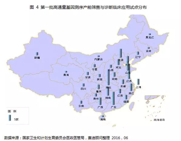 2015年3月,卫计委医政医管局发布第一批肿瘤诊断与治疗项目高通量基因测序技术临床试点单位名单。上海、北京、广东、天津由于拥有国内基因检测领域领军企业和众多高水平科研机构,具备着较高水平的基因检测技术以及配套人才,成为基因测序技术应用于肿瘤诊断与治疗的临床试点。