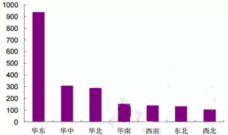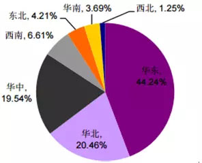 我国冷库储藏商品品类占比 根据数据统计,国内华东区域的冷库保有量最大,合计达900万吨,占比超过45%。我国冷库的整体建设发展失衡,主要分布在北京、上海等一线城市,而西北片区等内陆城市的分布相对较少。