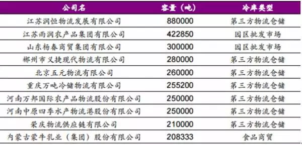 我国冷库保有量分布区域 我国冷库大多建于上世纪90年代,主要以氨为制冷剂,但由于氨毒性大容 易引起大爆炸,因此现在以二氧化碳制冷系统为主导的冷库成为发展主流。2015年我国冷库的总容量超过3000万吨,容量排在前十位的企业中以第三 方物流仓储为主。