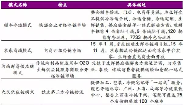 网购用户 2015 年网购生鲜的快递时长分布 随着生鲜电商产业的兴起,冷链物流业得到了高速发展。越来越多的冷链物流企业开始尝试在生鲜物流领域布局,包括了自建物流企业以及第三方物流企业。生产者通过冷链物流快捷、安全的方式将产品传递给下游的消费者,增强用户体验。 毫无疑问,生鲜电商带动了冷链物流产业的发展,但若由单个生鲜电商厂商独立承担物流,鲜有具备行业整合能力完成从预冷到销售全覆盖的厂商,且运输经营分散难以形成规模效应,因此看好第三方物流对冷链物流行业整合渗透。目前国内已形成包括顺丰冷运模式、京东商城模式、河南鲜易供应链模式和九曳供应链模式在内的四种第三方冷链物流模式。