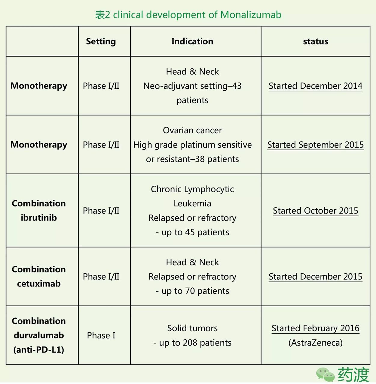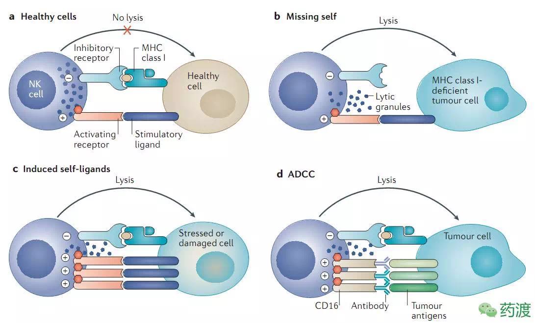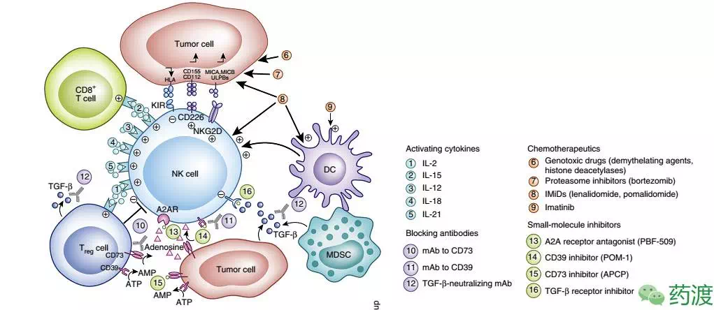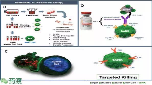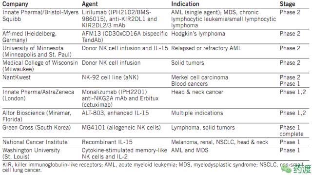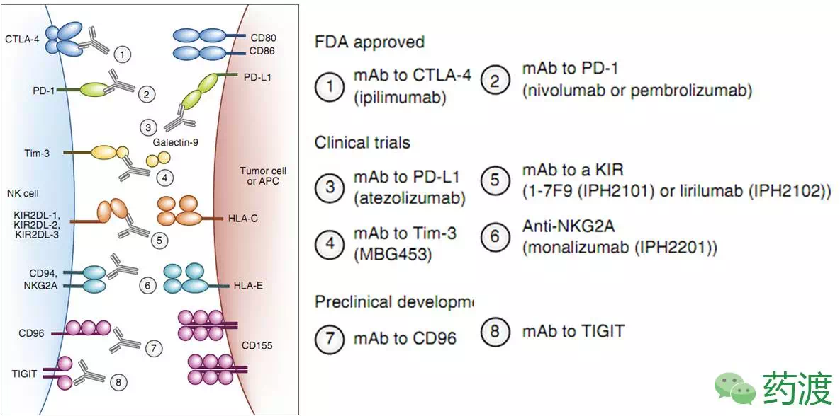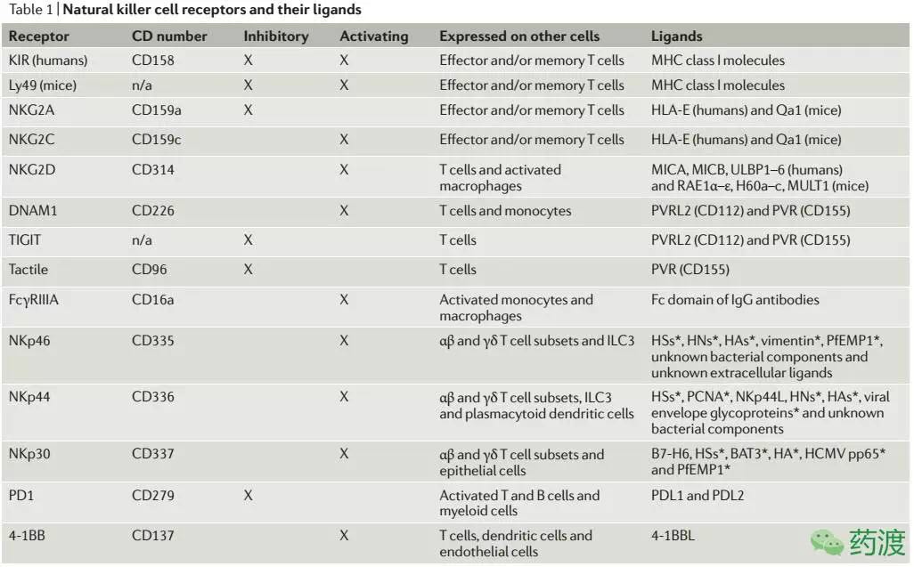 | 今年一月份,位于法国马赛的Innate Pharma公司和Sanofi签订了总额达4.5亿美元的合作协议,用于开发靶向NK细胞治疗肿瘤的双特异性抗体,其中靶向NK细胞靶点为NKp46。在此之前的2015年7月,NantKwest成功登陆纳斯达克,这个以NK细胞免疫治疗为核心技术平台的公司,上市首日暴涨39%,市值当日高达27亿美元。更让人羡慕嫉妒很的是,这个公司只有11名员工,当时人均价值超过两亿美元。 NK细胞简述 在人体内NK细胞主要特征为CD3-CD56+淋巴细胞群,其中血液中主要为CD16+CD56dim亚型。NK细胞作为天然免疫系统的重要组成部分,在清除衰老细胞、病原微生物入侵时发挥着重要作用。由于NK细胞不同于T细胞和B细胞,缺少更多的基因重排过程。因此NK细胞不像T细胞一样通过特异性TCR识别靶细胞,而是通过胚系基因表达的受体识别靶细胞。为了避免对健康组织细胞造成误伤,NK细胞通过表达KIRs (immunoglobulin(Ig)-like receptors)、CD94–NKG2和MHCI-peptide结合来负调控活性。当NK细胞识别MHC所呈递peptide为自身抗原肽时,启动抑制信号,阻止NK对自身健康细胞的杀伤(图1-a)。一旦肿瘤细胞或其他损伤的细胞为逃逸获得性免疫追杀而下调MHC消除抑制信号,NK细胞恰好可以通过某些激活信号杀伤靶细胞(missing self) (图1-b)。即使存在抑制信号,NK细胞也可以通过启动强激活信号通路,来激活NK细胞杀伤靶细胞(图1-c)。NK细胞直接通过肿瘤细胞表面富集的IgG抗体启动ADCC功能,直接杀伤肿瘤细胞,ADCC也是NK细胞杀伤靶细胞的主要方式(图1-d)。 ![]() 图1 NK细胞主要功能 由于和T细胞具有不同的机制,在肿瘤细胞试图通过下调MHCI复合物逃脱T细胞监控时,恰好就落入NK细胞的火力范围。当然,NK细胞也可以通过分泌细胞因子直接发挥抗肿瘤作用,或调动树突细胞、巨噬细胞和T细胞等免疫细胞共同参与到清除肿瘤细胞的过程。 鉴于NK细胞自身的作用机制,在肿瘤免疫治疗中,主要通过以下策略来促使NK细胞发挥最大的作用:1、免疫检查点抑制剂,解除NK细胞的抑制信号;2、激活NK细胞活性功能;3、靶向抗体治疗,通过ADCC来清除肿瘤细胞;4、细胞治疗。 为方便后文的理解,我们先浏览一下NK细胞主要配体和受体以及主要作用机理(表1 所示)。 ![]() 一、NK细胞——免疫检查点抗体 早在2002年,一个意大利科学小组发现,在进行骨髓移植治疗急性骨髓淋巴瘤病人时,KIR-MHCI不配对病人组,五年无复发存活率为100%。但是在KIR-MHCI相匹配病人组中这一数据仅为25%。第一次在人体临床中证实了NK细胞对治疗肿瘤的重要作用。同时也让科学家想到,抑制KIR-MHCI的结合可能会对肿瘤有良好的治疗效果。 鉴于此,Innate Pharma成了最早吃螃蟹的人,并在2007年开始使用KIR抗体治疗恶性血液癌。在2011年以总计4.4亿美元的高价将anti-KIR单抗 (lirilumab)授权给了BMS做后期临床开发,随后BMS放手一搏,围绕lirilumab同时开展了七个临床试验(附表2)。然而在单独使用lirilumab治疗多发性骨髓瘤的二期临床试验中,并没有达到预期的效果。尽管如此,BMS仍然义无反顾的推进联合使用的临床试验,确信在联合使用中会收到更佳的疗效。不久之后,Innate Pharma更以高达12.7亿美元的总价把靶向CD94/NKG2A的Monalizumab单抗转让给了阿斯利康,阿斯利康也不甘示弱,围绕Monalizumab同时开启了5项临床试验(附表3)。除NK细胞本身特异性受体外,还表达有其同T细胞共有的checkpoint inhibitors (图2),包括现在最火热的PD-1抗体。 ![]() 图2 Checkpoint inhibitors of NK cell 二、直接激活NK细胞功能 在肿瘤免疫中,最直接方案是直接激活NK细胞杀伤肿瘤细胞,其中NKG2D、NCR、CD226和CD16为最常见激活NK细胞受体。 NCRs发现于上世纪九十年代,包括NKp30、NKp44、NKp46三种受体,在肿瘤细胞和健康组织中都有表达。其中NKp44仅在NK细胞被激活后才会表达,起到进一步放大信号的作用。 NKG2D广泛表达与NK细胞和CD8+T细胞,研究的也比较深入。NKL2D配体(NKG2DL)在健康组织细胞上几乎不表达,但是在快速复制的细胞,肿瘤细胞,以及被病毒细菌侵染细胞及其他变形老化细胞会表达并展示在细胞表面。肿瘤细胞表面的NKL2DL可以激活NK细胞,甚至使MHCI/KIR抑制信号失效。但是在肿瘤组织中,肿瘤细胞可以通过释放可溶性的NKL2DL中和NKL2D,帮助肿瘤逃脱NK细胞的监控。 在人体中CD16a主要在CD56 dim亚型NK细胞表达。前面讲述过,NK细胞主要通过ADCC来清除肿瘤细胞,ADCC发动的机理则主要依赖抗体Fc和NK细胞表面的CD16a的结合。ADCC已成为抗体治疗肿瘤领域的主要作用机制,其中trastuzumab (anti-HER2)、cetuximab (anti-EGFR)或者rituximab (anti- CD20)就是典型的ADCC依赖型抗体。 在肿瘤组织中NK细胞的激活受体,会受到多种影响,为了进一步提高NK细胞对肿瘤细胞的特异性靶向杀伤,双特异性抗体成为优选策略。本文开始提到的Innate pharma和Sanofi合作的双特异性抗体就是其中之一,针对NK细胞靶点为NKp46。此外专注于双特异性抗体研发的Affimed公司也聚焦于NK细胞的抗肿瘤应用,其中用于治疗霍奇森淋巴瘤的AFM13主要通过同时靶向CD30×CD16a来聚集NK杀伤肿瘤细胞。 除此之外,还有诸多细胞因子参与激活NK细胞和促进NK细胞向肿瘤部位的迁移(图3)最为关注的为IL-15,在一项非霍奇金氏淋巴瘤中研究中发现血液中高浓度的IL-15可以有效提高患者的存活率。在NK细胞体外培养中IL-15是诱导NK细胞扩增的主要因子。 ![]() 三、NK cell therapy 在CAR-T疗法引起千军万马共闯独木桥时,NK细胞疗法也高调进入肿
