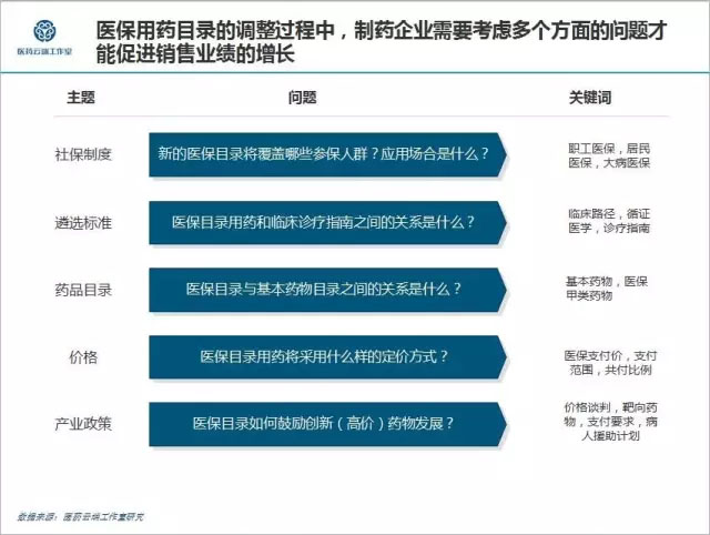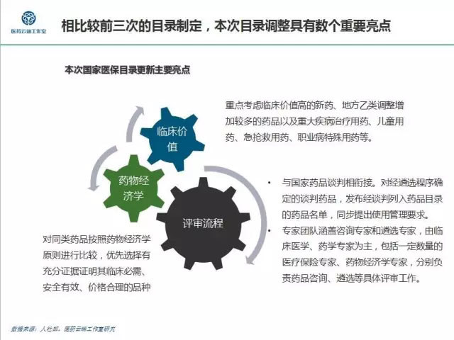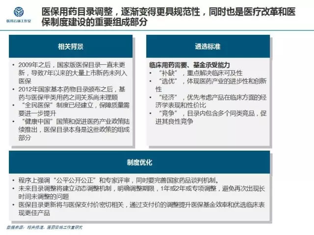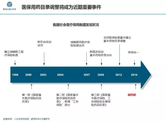 今年9月30日,《2016年国家基本医疗保险、工伤保险和生育保险药品目录调整工作方案(征求意见稿)》发布,这是我国国家版医保目录自2009年以来,时隔7年的首次调整。 人不可能两次踏入同一条河流之中。与七年前相比,我国的医疗体系和医疗保障制度已经发生了翻天覆地的变化。 由此,面对本次医保目录的调整,制药企业显然需要与时俱进的战略,才能更有效地抓住这一机遇,成功实现企业在业绩增长和社会责任方面的双重收益。 日前,医药云端工作室正在进行深入研究,探索医保目录变化未来对行业和企业的影响。与此同时,本工作室也十分愿意分享部分研究成果,以此表达与行业内各界人士进一步合作的意愿,通过业内的交流互动以及合作,为各大企业的成长贡献绵薄之力。 本次分享的内容来自医药云端工作室外部专家黄东临的大力支持,对此致谢。