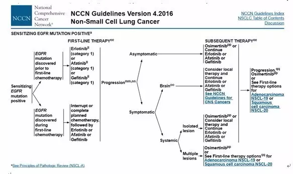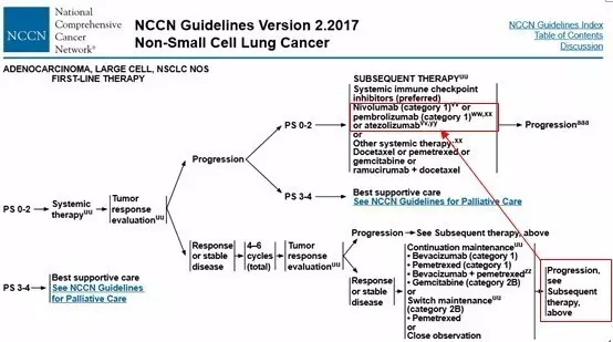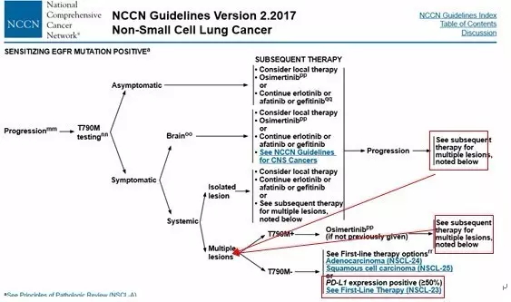 ![]() 近日公布的2017版NCCN指南焕然一新,靶向及免疫治疗的飞速进展彻底改变了我们延习多年的NSCLC治疗模式。尤其是在晚期非小细胞肺癌的治疗流程及一线进展后临床处理上,展现出了很多新面孔。下面就以2016.4版及2017.2版的NCCN指南对比来详细解析。 一、晚期非小细胞肺癌一线治疗更新——ROS1与PD-L1 ![]() 众所周知,在包含2016版之前的版本中,对于晚期NSCLC特别是非鳞非小细胞肺癌需要常规检测EGFR/ALK基因的突变情况,对于突变阳性的患者一线推荐使用TKI类靶向药物。而2017版中赫然多了ROS1基因的融合检测及PD-L1的表达检测。将患者人群更加细分化,提出新的一线治疗理念。 (1)对于ROS1重排阳性的患者,一线推荐克唑替尼用药,病情进展后可以进行化疗或PD-1的免疫治疗。 ![]() (2)对于PD-L1表达≥50%的EGFR/ALK/ROS1阴性的患者,一线可以直接选用PD-1单抗KEYTRUDA用药。治疗失败后可更换化疗。 ![]() 晚期NSCLC的一线治疗一分为三,一条以驱动基因为基础的靶向治疗之路,此为首选。另一条是在无驱动基因下对PD-L1检测,若高表达(≥50%),可以使用keytruda ;第三条,没有任何适应症的患者可以一线化放疗。 二、EGFR基因突变的二线治疗——T790M靶向药物Osimetinib(AZD9291) EGFR TKI类药物易瑞沙、特罗凯曾经在肺癌治疗史创下一段传奇,而TKI的耐药也成为了临床处理的常见难题之一,对于这种有明确驱动基因的肺癌类型在一线TKI治疗失败的情况下即放弃靶向之路转为化疗的临床处理实属可惜。而针对T790M继发耐药突变的靶向药物AZD9291成功地延续了EGFR的神话。其在二线甚至是一线上展现出的临床疗效在2017版的指南中得到了公认。 两图对比可见,对于TKI耐药进展的患者,2017版中直接要求检测T790M的突变状态,对于有症状的多发进展患者直接使用Osimetinib (AZD9291),其他T790M阳性的缓慢进展患者在附一局部治疗外可以直接选用Osimetinib,也可以进行一代TKI的沿用,但在进展后可再次使用Osimetinib。相信随着Osimetinib(AZD9291)的普及,其对于T790M的患者的一线二线三线治疗将形成垄断治疗模式。 ![]() ![]() 三、免疫治疗 免疫治疗的突破发展在新版的NCCN指南中展现无余,除了之前提到的对于PD-L1≥50%的晚期NSCLC可以一线使用PD-1单抗外,在化疗、靶向治疗失败的二线及三线治疗上都可以看到PD-1单抗的身影。 1.化疗失败后选用PD-1单抗 ![]() 2.EGFR靶向治疗失败后选用PD-1单抗 ![]() 3.ALK靶向治疗失败后选用PD-1单抗 ![]() 4.ROS1靶向治疗失败后 ![]() 免疫治疗已成为化疗及靶向治疗失败后患者的有力选择,但与2016版不同的是,除了化疗失败后可直接选用PD-1单抗nivolumab或Keytruda外,EGFR/ALK/ROS1靶向治疗失败后的患者在选用PD-1单抗时要求肿瘤PD-L1高表达(≥50%),增加了药物适用人群的筛选,这基于临床试验数据及opdivo的一线失败的经验教训,适度避免了免疫药物的泛滥使用。 |