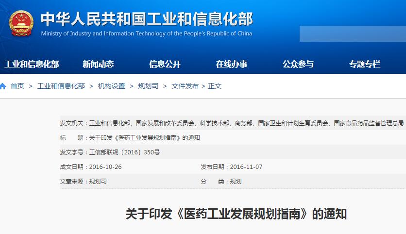 11月7日,国家工信部、国家发改委、科学技术部、商务部、国家卫生和计划生育委员会、国家食品药品监督管理总局六部门联合发布了《医药工业发展规划指南》,旨在贯彻落实《中华人民共和国国民经济和社会发展第十三个五年规划纲要》和《中国制造2025》,指导医药工业加快由大到强的转变。 规划指南提出八项主要目标,到2020年,规模效益稳定增长,创新能力显着增强,产品质量全面提高,供应保障体系更加完善,国际化步伐明显加快,医药工业整体素质大幅提升。 规划指南提出八大重点任务,增强产业创新能力、提高质量安全水平、提升供应保障能力、推动绿色改造升级、推进两化深度融合、优化产业组织结构、提高国际化发展水平、拓展新领域发展新业态等。 规划指南还提出推进重点领域发展,包括生物药、化学药、中药、医疗器械、药用辅料和包装系统、制药设备等领域。 附全文 医药工业发展规划指南 医药工业是关系国计民生的重要产业,是中国制造2025和战略性新兴产业的重点领域,是推进健康中国建设的重要保障。“十三五”时期是全面建成小康社会决胜阶段,也是我国医药工业整体跃升的关键时期。为加快医药工业由大到强的转变,根据《中华人民共和国国民经济和社会发展第十三个五年规划纲要》和《中国制造2025》,编制本指南。 一、“十二五”发展回顾 (一)规模效益快速增长。 “十二五”期间,规模以上医药工业增加值年均增长13.4%,占全国工业增加值的比重从2.3%提高至3.0%。2015年,规模以上企业实现主营业务收入26885亿元,实现利润总额2768亿元,“十二五”期间年均增速分别为17.4%和14.5%,始终居工业各行业前列。在规模效益快速增长的同时,产品品种日益丰富,产量大幅提高,在保供应、稳增长、调结构等方面发挥了积极作用。 (二)创新能力显着提升。 2015年规模以上企业研发投入约450亿元,较2010年翻两番。在“重大新药创制”科技重大专项推动下,涌现出一 批高质量创新成果,“十二五”期间210个创新药获批开展临床研究,埃克替尼、阿帕替尼、西达本胺、康柏西普等15个1类创新药获批生产,110多个新化学仿制药上市,中药质量控制与安全性技术水平提升,PET-CT、128排CT等一批大型医疗设备和脑起搏器、人工耳蜗等高端植入介入产品获批上市。以屠呦呦获得诺贝尔奖为代表,我国医药创新进一步得到国际认可。 (三)质量管理不断加强。 国家药品医疗器械标准提高行动计划继续推进,《中国药典》(2015版)发布执行,药品标准进一步与国际接轨。全产业链各环节质量管理规范不断健全,《药品生产质量管理规范(2010年修订)》(药品GMP)全面实施。一批优势企业生产质量管理与国际先进水平接轨,累计600多个原料药品种和60多家制剂企业达到国际先进水平GMP要求。 (四)技术装备大幅升级。 “十二五”期间全行业完成固定资产投资超过2万亿元,规模较“十一五”大幅增长,增速居工业各行业前列,促进了医药工业技术装备水平整体跃升。生产过程自动化、智能化水平明显提高,生物催化、手性合成、调释给药等先进技术得到产业化应用,中药全过程质量控制水平提高,生物药大规模高效培养接近国际先进水平。 (五)重组整合快速推进。 企业兼并重组数量增多,规模扩大,“十二五”期间收购兼并交易额达1500亿元以上。大型企业进一步做大做强,工业主营业务收入超过100亿元的企业达到16家,一批创新型中小企业高速发展。产业和金融深度融合,89家企业在国内外证券市场上市,另有200余家企业在新三板挂牌,创业投资、股权投资基金大量投资医药领域,促进了行业资源整合和企业核心竞争力提升。 (六)国际化步伐加快。 出口稳定增长,2015年出口额达564亿美元。出口结构改善,制剂和医疗设备出口比重加大,面向发达国家市场的制剂销售实现突破。药品研发加快与国际接轨,累计上百个仿制药获得欧美国家注册批件,50多个新药开展国际临床研究。境外投资从设立研发中心向建立生产基地发展,超亿美元的境外并购项目达10个以上。 但医药工业发展仍存在一些问题,主要表现在:原始创新能力不强,基础研究和转化研究能力薄弱,高质量创新成果少;产品质量升级任务紧迫,化学仿制药、中药材和中成药、医疗设备、辅料包材等领域质量标准和质量水平亟待提高;药品供应保障存在短板,低价药、儿童用药和罕见病药短缺情况仍有发生;清洁生产和“三废”治理水平较低,化学原料药可持续发展能力不足;行业集中度低,企业多、小、散,产品同质化和重复建设突出;国际竞争力弱,出口产品附加值低;研发、营销等环节存在不规范行为,影响行业良性竞争和健康发展。 二、“十三五”发展形势 (一)市场需求稳定增长。 从全球看,发达经济体医药市场增速回升,新兴医药市场需求旺盛,生物技术药物和化学仿制药在用药结构中比重提高,为我国医药出口带来新的机遇。从国内看,国民经济保持中高速增长,居民可支配收入增加和消费结构升级,健康中国建设稳步推进,医保体系进一步健全,人口老龄化和全面两孩政策实施,都将继续推动医药市场较快增长。 (二)技术进步不断加快。 精准医疗、转化医学为新药开发和疾病诊疗提供了全新方向,基于新靶点、新机制和突破性技术的创新药不断出现,肿瘤免疫治疗、细胞治疗等新技术转化步伐加快。医疗器械向