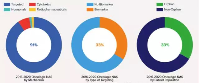 全国医院和医生数量 截止2015年末,全国医疗卫生机构数达99.0万个,其中医院2.7万个,公立医院13069个,民营医院14518个;医院按等级分三级医院2123个,二级医院7494个,一级医院8757个,未定级医院9213个。现有在建医院数量将近1000个。公立医院中,卫生技术人员达到427.7万人,民营医院中卫生技术人员79.4万人。约有4.4万名医生注册了多点执业,其中到民营医院执业的占到了35.6%。2014年《全国卫生年鉴》统计显示,中国共有肿瘤专科医院60多家,21000名肿瘤专科医生(未统计影像、放射等相关科室)等,对应每年300-400万的新增病例,肿瘤医生人数不能满足患者需求。目前有越来愈多的医院和科室的医生参与到肿瘤的治疗中来,但中国尚没有肿瘤专科医生制度,中国肿瘤治疗的规范性以及理念和水平的提高是当务之急。 目前三级综合医院肿瘤科和肿瘤专科医院的患者量大多处于饱和状态,随着肿瘤筛查诊断渗透率的上升和患者就诊意识的提高,公立医院难以满足日益增长的肿瘤患者治疗需求,会有部分治疗导流到低级别公立医院和民营医院进行。政府通过行政手段促成地市级肿瘤医院和三级医院组成医联体,以促进医院之间的会诊、转诊合作,实现医疗资源逐步下沉。民营资本有望利用其资金的力量配备优质的医生资源、先进的设备,并通过提供良好的就诊体验,涉足肿瘤医疗服务市场。 药品市场和预估 国际市场 2020年全球医疗消费将达1.4万亿美元,相比2015年复合增长率为4%-7%,拉动因素为品牌药走高、新兴市场爆发等。全球抗肿瘤药物市场复合增长率为6.5%,截至2020年,全球肿瘤花费将超过1500亿美元,抗肿瘤药将占有医疗消费11%的市场,靶向抗癌药将会是抗癌新药的主角。未来五年内全球将有225个新药上市,其中三分之一为抗肿瘤药物以及罕见病药物,且都将处在一个较高的售价,不少抗肿瘤药物正在进行再次开发,扩大适应症,以便为更多的病人提供治疗选择。预期抗肿瘤药物市场规模将会持续扩张,重磅级的抗肿瘤新药呼之欲出。IMS报告显示,抗癌新药的作用机制,靶点类型和用药人群如下图所示。