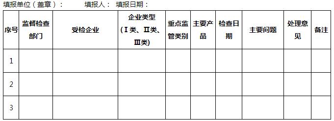 填表说明:“监督检查部门”填写各区局或直属分局简称;“受检企业”应填写企业全称;“重点监管类别”应填写“国家重点监管企业”、“北京市重点监管企业”或“非重点监管企业”;“主要产品”应填写本次监督检查所涉及的产品名称,不能填写企业的生产范围或产品的医疗器械分类名称、代号;“检查日期”的格式请统一按照如“20160708”格式填写;“主要问题”应就检查发现企业存在的问题做概括性说明,把主要问题阐述清楚即可,不必完全按照监督检查文书内容填写;“处理意见”只需填写“立即整改”、“限期整改”、“停产整改”或“立案处罚”,如已经完成整改,则应在备注中标明“完成整改”。 |