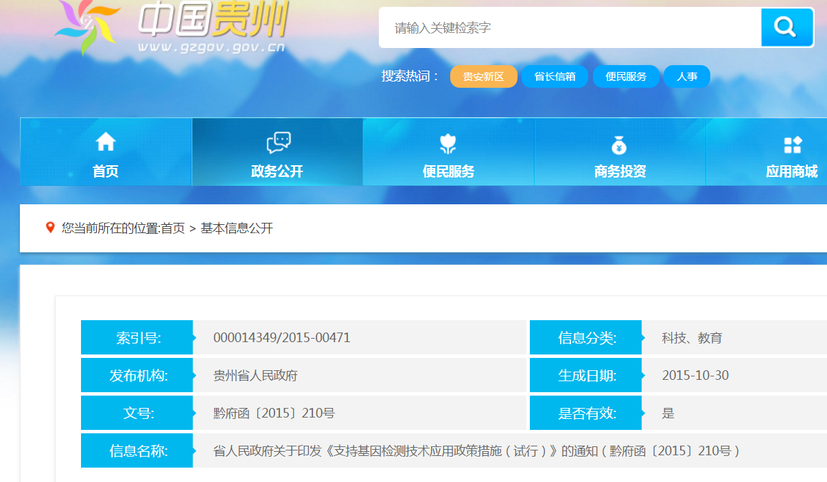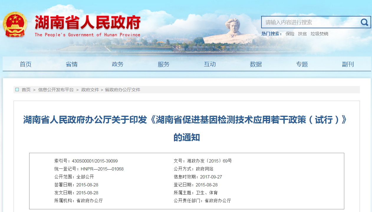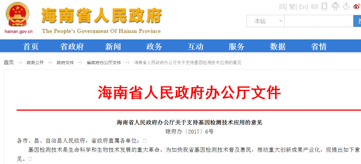 ![]() 为了加快基因检测技术普及惠民,推动重大创新成果产业化,1月16日,海南省人民政府发布了《海南省人民政府办公厅关于支持基因检测技术应用的意见》,这也是继湖南、贵州、福建等地之后,又一省份发布政策措施支持促进基因检测技术的应用。 发展基因产业已上升为国家战略 ![]() 2015年,发展基因产业上升为了国家战略,基因检测技术被列入“新型健康技术惠民工程”。国家发改委发布《国家发改委关于实施新兴产业重大工程包的通知》,强调了重点发展基因检测等新型医疗技术,快速推进基因检测临床应用以及基因检测仪器试剂的国产化,3年内建设30个基因检测技术示范中心,以开展遗传病和出生缺陷基因筛查为重点,推动基因检测等先进健康技术普及惠民,引领重大创新成果的产业化。 2016年3月,“基因组学”列入“十三五”规划纲要草案:“战略性新兴产业发展行动”中提出“加速推动基因组学等生物技术大规模应用”。 2016年4月,国家发改委办公厅下发有关复函,批复在全国建设27个基因检测技术应用示范中心,从国家战略层面上加速推动我国基因产业规范化和跨越式发展,旨在大力发展基因检测技术,提高出生缺陷疾病、遗传性疾病、肿瘤、心脑血管疾病、感染性疾病等重大疾病的防治水平,全面提高人口质量。 2017年1月,国家发改委正式印发了《“十三五”生物产业发展规划》,明确了基因检测能力覆盖50%以上出生人口的目标,强调了以个人基因组信息为基础,结合蛋白质组、代谢组等相关内环境信息,整合不同数据层面的生物学信息库,利用基因测序、影像、大数据分析等手段,在产前胎儿罕见病筛查、肿瘤、遗传性疾病等方面实现精准的预防、诊断和治疗。 各省相继发布政策支持基因检测技术的应用 基因检测技术是生命科学和生物技术发展的重大革命。近年来,国内各省份陆续发布政策支持基因检测技术的应用,鼓励开展和推广遗传病基因检测、开展基因检测试点、大力推广个性化医疗、探讨基因检测的收费体制等。 海南省:《海南省人民政府办公厅关于支持基因检测技术应用的意见》 ![]() 1月16日,海南省人民政府官方网站发布了《海南省人民政府办公厅关于支持基因检测技术应用的意见》(简称《意见》),提出了12个意见:组建网络化基因检测机构体系,支持拓展业务、技术发展空间,探索完善基因检测付费机制,支持基因检测技术研发及产业化,支持人才队伍建设,加大重点项目支持,加大融资支持,鼓励开展对外合作,支持先进基因检测技术的研发和产业化,落实财税扶持政策以,加强组织协调。 《意见》鼓励有条件的市县针对新生儿遗传性耳聋、唐氏综合征等遗传性疾病进行基因检测筛查,开展针对地中海贫血的遗传筛查和产前诊断、高龄产妇无创DNA检测以及肿瘤、心脑血管疾病和感染性疾病等重大疾病的基因检测。 在遵循知情、自愿、保密的原则下,针对肿瘤、心脑血管疾病和感染性疾病等重大疾病防治的基因检测技术应用,可探索采取财政补助和患者自付相结合等多种方式。支持基层医疗卫生机构将医学检验服务整体委托给具有资质的省内第三方医学检验机构。支持依托有资质的医疗机构建立精准医学中心,运用基因检测技术开展精准医疗和个体化用药,提高治疗有效性和安全性。 鼓励有资质的医疗、医学教育、科研机构依法依规开展实验室研发测试(LDT)的临床应用,进行重大疾病的预测、早期诊断与个体化治疗。选择我省中西部作为试点地区开展基因检测技术应用专项行动,针对生育智力障碍患儿、夫妇之一系智力障碍或夫妇均系智力障碍患者的对象,且现无存活子女的计划生育特殊家庭,可探索由财政专项资金和指定有资质的医疗机构共同出资,免费开展产前诊断服务,降低出生缺陷儿的出生概率。 湖南省:《湖南省促进基因检测技术应用若干政策(试行)》 ![]() 2015年8月28日,湖南省人民政府印发了关于《湖南省促进基因检测技术应用若干政策(试行)》的通知,为加快海南省基因检测技术的发展和普及,提出了12项政策。 鼓励有条件的地区针对新生儿遗传性耳聋、唐氏综合征等遗传性疾病进行基因检测筛查,在遵循知情、自愿、保密的原则下,以政府采购的方式开展和推广。针对肿瘤、心脑血管疾病和感染性疾病等重大疾病防治的基因检测技术应用,可采取政府采购和患者自付相结合的方式。支持基层医疗卫生机构将医学检验服务整体外包给具有资质的省内第三方医学检验机构。应用成效显著的地区或机构,在医疗机构布局审批、开展试点示范、争取相关专项上享有同等优先权。 大力推广基于基因检测技术的精准医疗和个体化用药,提高治疗的有效性和安全性。鼓励具有资质的单位依法依规开展实验室研发测试(LDT)的临床应用,进行重大疾病的预测、早期诊断与个体化治疗。 选择一批试点地区开展基因检测技术应用专项行动,针对曾生育智力障碍患儿或夫妇之一系智力障碍患者的对象,且现无存活子女的计划生育特殊家庭,由省政府专项基金和指定有资质的医疗机构共同出资,免费开展"先证者诊断"及产前诊断服务,降低出生缺陷儿的出生概率。 贵州省:《支持基因检测技术应用政策措施(试行)》 ![]() 2015年9月22日,贵州省政府印发了《支持基因检测技术应用政策措施(试行)》的通知,提出了12条支持政策,包括组
