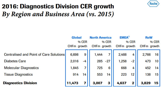 表1.罗氏2016年财务数据 (单位:百万瑞士法郎) 诊断产品线 罗氏诊断业务分为4大板块,分别是中心实验室和POC诊断(Centralised and Point of Care Solutions,之前称为专业诊断),糖尿病管理(Diabetes Care),分子诊断(Molecular Diagnostics)和组织诊断(Tissue Diagnostics)。 中心实验室和POC诊断功不可没,增长9%,其中免疫诊断和生化诊断分别增长13%和6%; 糖尿病管理业务由于美国市场的降价压力,下降4%,近两年糖尿病管理业务持续下滑; 分子诊断业务增长7%,其中微生物学诊断销售增长9%,HPV(人乳头状瘤病毒)筛查增长8%,得益于在很多国家中标,血液筛查业务也增长5%; 组织诊断增速达到14%,其中伴随诊断业务大增46%。