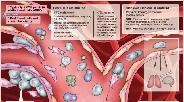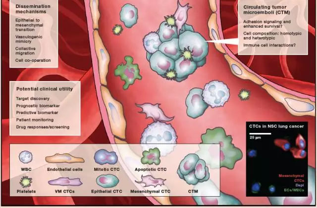 循环肿瘤细胞(CTC,Circulating Tumor Cell)是存在于外周血中的各类肿瘤细胞的统称,因自发或诊疗操作从实体肿瘤病灶(原发灶、转移灶)脱落,大部分CTC在进入外周血后发生凋亡或被吞噬,少数能够逃逸并锚着发展成为转移灶,增加恶性肿瘤患者死亡风险。 大量研究表明,CTC以不同形态存在于外周血中,既有游离的单个CTC,也有聚集成团的细胞团(CTM)。肿瘤细胞在进入外周血循环的过程中会发生上皮-间质转变(EMT),故CTC存在不同类型,包括上皮细胞表型、间质细胞表型和上皮细胞与间质细胞混合表型。CTM和间质细胞表型CTC具有更强的转移潜能。 通过CTCs来研究肿瘤生物学——由技术进步引起的复兴! 循环肿瘤细胞CTCs,1869年澳大利亚病理学家John Ashworth首次提出这一概念。在1ml血液里约含有5百万个单核细胞的背景条件下来研究罕见稀有的肿瘤细胞犹如大海捞针,这是CTCs研究面临的主要技术挑战。如今,在细胞富集、分离、分子分析和生物信息学等方面的卓越的技术发展重燃CTCs这一领域的研究。研究发现肿瘤细胞的扩散传播是肿瘤患者死亡的主要原因。 利用肿瘤细胞表面标记物或肿瘤细胞的物理特性进行CTCs的富集,例如细胞的大小和形态;这些都是肿瘤细胞的特性。任何一种富集CTC的技术都有可能因为稀有的肿瘤细胞与血细胞具有相同的特点,而不能富集到真正意义上的循环肿瘤细胞的风险。 最近的一项处理技术完全的跳过了循环肿瘤细胞富集这一步骤,而是对每一个细胞进行鉴定分析,接着是肿瘤细胞的识别,通过精细复杂的单细胞选择设备,或者通过介电电荷传递单-CTC分子分析的物理分离方法。 患者的循环肿瘤细胞能够在体外或免疫功能不全的小鼠体内生长,再通过高分辨率显微镜观察他们的生物学行为。 循环肿瘤微栓——团伙协同生存之旅! 形成循环肿瘤微栓(CTM))即CTCs集群是肿瘤转移最主要的危险先兆,CTM细胞成分包含有血小板、基质细胞、造血细胞等;但每一种细胞在CTM中扮演的角色还不清楚。普遍的观点认为:单独的CTC在循环过程中容易死亡,而肿瘤微栓中的肿瘤细胞受到保护而免于凋亡。一个含有20-30个细胞的CTM是怎样穿过狭窄的毛细血管形成新的病灶,或许是加强对肿瘤细胞的保护免于免疫系统的攻击有关。 CTCs的分子特性——单细胞革命 结合高效的细胞富集方法和分子生物学的进步使得单个CTC或CTM的DNA和RNA研究阐明肿瘤的异质性和初级肿瘤与二级肿瘤之间的关联。CTC DNA整个基因组的扩增已经被用来证实肿瘤拷贝数变化和体细胞突变的存在。单个CTC RNA分析为确立每个取样细胞的生物学功能、识别潜在的药物靶点建立方法,例如EMT在疾病的进展过程中。整合单细胞RNA 、DNA的方法有利于建立潜在基因/表观遗传变化和RNA链之间的关联。 CTCs的播散 CTC致瘤性测试,通过肿瘤患者血样中的CTC扩增移植模型(CDX),乳腺癌,小细胞肺癌、黑色素瘤,CDX使肿瘤疾病的生物学进展得到全面分析,肿瘤潜在新疗法的体内试验成为可能。同时,CTCs的富集和体外培养蓄势待发,潜在的实时药物敏感测试(当肿瘤活检更具挑战性),为耐药机制的研究提供难得的机会。 CTCs的临床应用 最近,外周血中循环肿瘤细胞DNA(ctDNA)的分离,分子分析取得的巨大进步预示着“液体活检”的黄金时代。鉴于大量的具有里程碑意义的ctDNA的研究证明了ctDNA的临床应用潜力,美国FDA批准了首个基于ctDNA的伴随诊断; 尽管FDA认识到在近十年里,CTC在许多癌症的预后可作为评估肿瘤患者的管理工具,但CTC的临床应用一直表现平平。最近随着CTC异质性和CTC体内、体外扩增技术的研究以及改进的单细胞分子分析,CTC领域在癌症扩散和治疗反应在生物学方面提供了独特见解。联合CTC、CTM和ctDNA扩大提高了液体活检的临床效用。