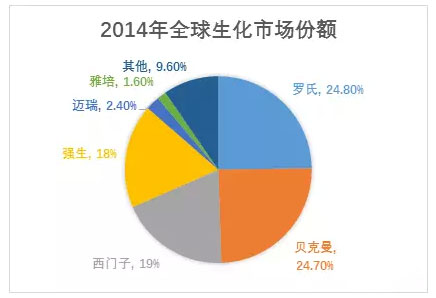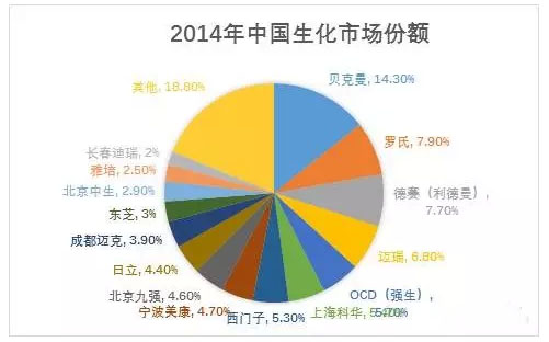 全球生化诊断市场半壁江山被罗氏和贝克曼·库尔特(丹纳赫)所占据,前四家占据85%的份额。
