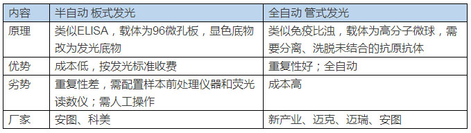 我国生化诊断市场经过十几年的进口替代进程,国产品牌开疆拓土,包括利德曼、迈瑞、科华、美康、九强、迈克、中生、迪瑞等企业。 2.临床免疫 主题词:发光是主流 2.1 定义及分类 临床免疫诊断包括化学发光、酶联免疫、胶体金、生化中的免疫比浊和胶乳项目、特种蛋白仪等。狭义临床免疫通常指化学发光。 化学发光分析仪系统是试剂、仪器和分析方法三位一体结合的产品 目前市面上已经实现商品化和产业化的化学发光免疫分析仪按自动化程度分类,可分为半自动(板式发光 酶免)和全自动(管式发光)两类。 2012年之前,国产品牌大多集中在半自动化板式发光产品领域,到2015年底,拿到化学发光注册证的国产厂家有50家,其中15家是全自动化管式发光,其余均为板式发光。 未来随着成本下降,管式发光市场份额会逐渐增大。