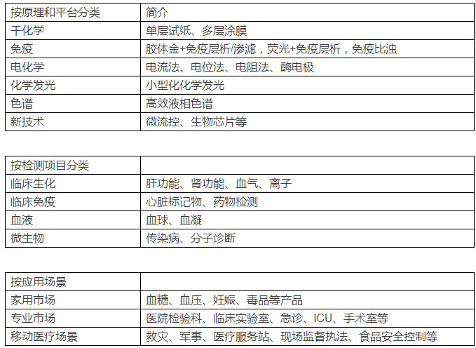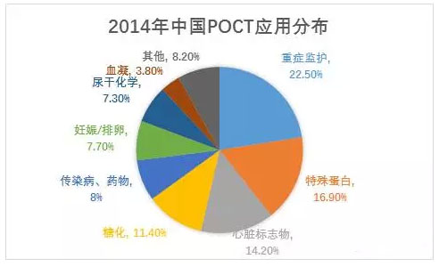 分子诊断广泛应用于传染病、血筛等领域,随着人们生活水平的提高,对分子诊断的认知和需求会越来越多,医疗卫生产业发展不再局限于诊疗,而是延伸到预防性医学。随着人类基因图谱的破译,分子诊断在个体化精准治疗甚至大消费方面也有广阔前景。 分子诊断未来充满各种可能性,但要警惕精准诊疗的泡沫 分子诊断作为一项前沿技术,对医学诊断有很大贡献。目前在我国分子诊断主要应用是传染病的检测,比如HPV、HBV、HCV、HIV等。在产前筛查应用也相对成熟,如华大基因,贝瑞和康等,胎儿外周血游离DNA检测已经逐渐替代羊水穿刺技术。 5.POCT 属于检验的分类,非产品或项目 市场份额分散,行业增速较快,技术日新月异 POCT市场尚未成熟,各厂家市场份额较小,,整体处于量多质次的阶段 由于检验平台方法差异较大,统一检测项目有多种方法,参考范围难以界定,测量结果准确度难以保证,行业也没有相关质量控制标准,将会较长时间保持混沌分散状态。参考POCT国际巨头Alere的发展历程,行业内并购整合是最高效的发展模式