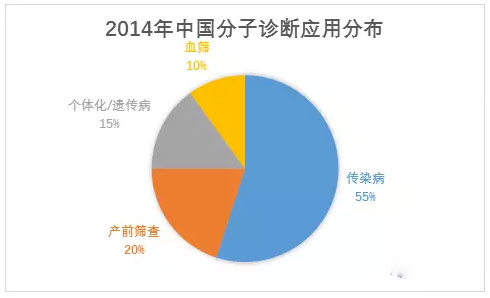 3.4 临床血球发展趋势 血球技术与流式细胞仪基本原理一致,但流式细胞仪的性能要求更为精细,在实验室作为科研仪器广泛使用。已经有一些大型高端医院,把流式细胞仪用于临床,分析血液中的有形成分来诊断血液疾病。血球检验会朝更自动化、集成化的方向发展。 此外一些生化检测项目,如CRP、糖化血红蛋白等项目,这两年来已经与血球检测捆绑进行,一管血即可完成,不需要再单独用血清进行生化检测,仅CRP一个项目,预计能带来10亿的市场空间。 4.分子诊断 主题词:待发展 4.1简介 分子诊断作为近几年的追捧热点,但临床应用尚有局限 分子诊断指应用分子生物学技术对与疾病相关的结构蛋白质、酶、抗原抗体和各种免疫活性分子,以及编码这些分子的基因检测。 根据检测技术的不同,可以分为核算杂交、PCR扩增、基因芯片、基因测序、质谱等。目前分子诊断已经广泛应用于传染病、血筛、早期诊断、个性化治疗、遗传病、产前诊断、组织分型等领域。