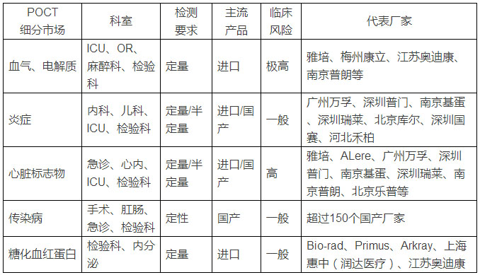 POCT市场特点: 1) 市场集中度低:POCT是IVD细分市场中较容易切入的市场之一,普遍规模较小。该领域的佼佼者是深圳国赛(特种蛋白)和南京基蛋(心肌标志物) 2)行业无统一标准 3) 国内检验科对POCT态度不一: ⊙二甲以上医疗机构由于资金雄厚,检验科设备多为进口品牌,常规检测为主,不需要POCT。临床科室使用POCT,会减少检验科的收入,因此限制POCT的广泛使用。 ⊙对临床科室来说定量/半定量的POCT产品临床意义重大,而且用量很大。如能采取更合理的利益分成方式,比如由检验科集中管理仪器,临床科室外借,或将推动POCT的发展。 ⊙二甲以下基层医院,检验科样本量少,技术水平相对较低,大型设备的实用性差,因此检验科通常使用POCT产品替代传统检验方法来诊断。由于检测量小,产品分散,这块市场通常不受国际厂家和国内一线品牌公司重视。 这5个细分领域中,技术平台、销售渠道、市场格局、经营状况等差异较大。
