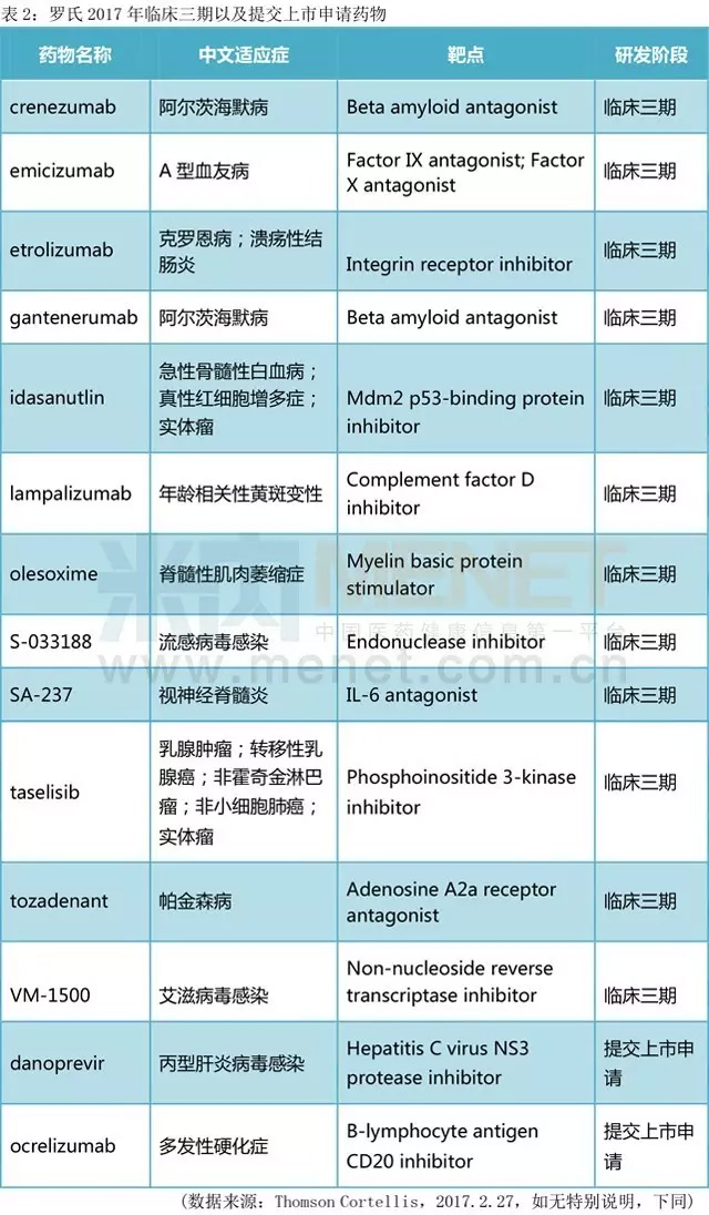 罗氏目前处于临床三期的药物有12个,处于提交上市申请阶段的药物有2个,其中Ocrelizumab是罗氏研发管线中最具重磅商业潜力的产品。Ocrelizumab是第一个在多发性硬化领域获得突破性疗法的产品,2016年向FDA提交了BLA申请,并获得优先审评资格,有望在今年上市。未来的5年里,多发性硬化症市场将达200亿美元,而Ocrelizumab的销售峰值有望突破50亿美元。
