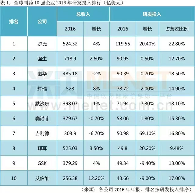 随着跨国药企2016年年报陆续披露,其研发投入也逐一浮出水面。在销售额保持增长的同时,罗氏、强生、诺华的研发也齐头并进,三巨头合计研发投入超300亿美元。砸下如此重金,钱都花哪儿了?重点研发品种都有哪些? 百尺竿头——10强研发投入仍给力 创新是企业发展的核心动力之一。新药研发催生出的一系列“重磅炸弹”,为一众跨国巨头带来巨额经济效益。与此同时,跨国药企作为引领全球制药行业的佼佼者,也一如既往地将研发放在举足轻重的位置。