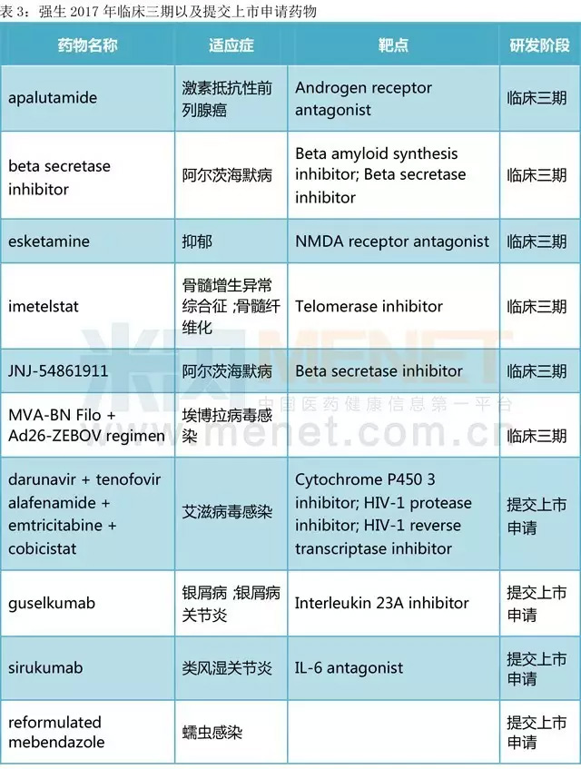 14个药物中,神经系统药物占据最大板块,其中用于治疗脊髓性肌肉萎缩症的Olesoxime获得了美国和欧盟孤儿药资格。抗肿瘤和免疫抑制剂与全身用抗感染药物各有3个,位列第二;感觉系统药物有2个,其中用于治疗年龄相关性黄斑变性的Lampalizumab有望在未来五年销售额突破10亿美元。消化系统及代谢药与血液造血系统药物各一个,其中用于治疗A型血友病的Emicizumab有望在未来五年达到近20亿美元的销售额。 NO2.强生——抗肿瘤药与自身免疫病用药两手抓