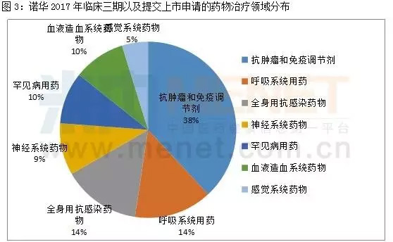 10个药物中,抗肿瘤和免疫调节剂占据最大板块,有抗肿瘤药物、免疫抑制剂各2个,这4个药物均具有重磅炸弹潜力。Guselkumab和sirukumab(免疫抑制剂)已在上文进行了分析,Apalutamide和Imetelstat是具有良好市场前景的抗肿瘤药。Apalutamide用于治疗激素抵抗性前列腺癌,预计2022年市场销售峰值能达到14.5亿美元。Imetelstat 是目前唯一一个在临床研究中显示出客观缓解的骨髓纤维化药物,具有强大的市场潜力,预计2019年能够上市。 NO3.诺华——研发管线涉及多领域,创新药与仿制药齐并进