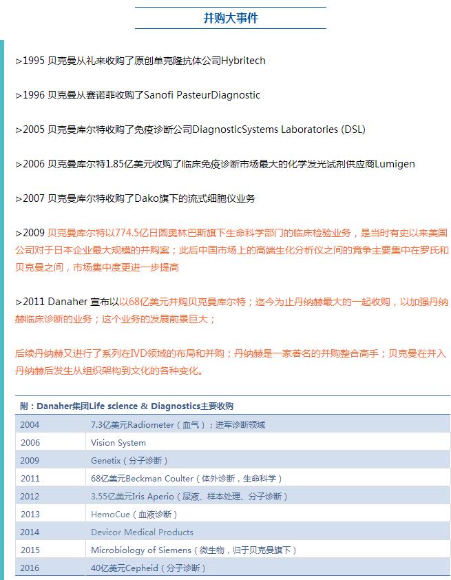 《2017全球顶级医疗器械巨头全攻略》—— Beckman Coulter业务概况 美国贝克曼库尔特有限公司研发、生产和销售全球领先的生命科学和临床诊断产品。 其客户遍布全球的制药和生物技术公司、大学、医学院、研究机构、医院、医师办公室,以及独立诊断实验室。 2011年,贝克曼被Danaher丹纳赫集团整体收购,成为Danaherqixia的 Life Sciences & Diagnostics业务中占比最大的公司。