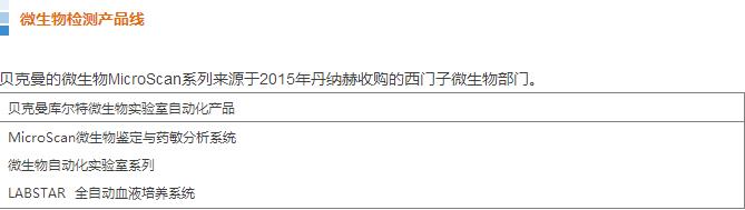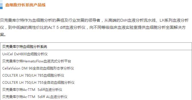 2016年Q1、Q2丹纳赫的生命科学和诊断业务因收购带来超过40%的同比增长;Q3开始诊断业务在财报里独立显示,同比增长3%;Q4诊断业务同比增长11%,其中因收购带来的营收增长占9.5%。 贝克曼库尔特诊断产品分析 贝克曼库尔特临床诊断主要产品包括:实验室自动化系统、生化分析系统、免疫分析系统、生化免疫一体化系统、血细胞分析系统、特定蛋白分析系统、尿液分析系统、微生物检测系列、血站血型分析系统。 免疫诊断产品线 在免疫领域,化学发光产品是红海:2003年西门子最早进入中国市场,随后贝克曼,雅培等企业纷至沓来。目前雅培在传染病领域拔得头筹,罗氏在肿瘤领域占领先机。 贝克曼的全自动化学发光分析系统是和巴斯德研究院合作设计的,主要分Access系列和DXI系列,其中DXI系列是高速仪器,可达400T/H,主推高端医院,甲状腺和激素项目属于拳头产品。其配套项目超过60个,涵盖:激素、肿瘤标志物、贫血、心脏标志物、产前筛查、传染病、甲状腺功能等12个大类。