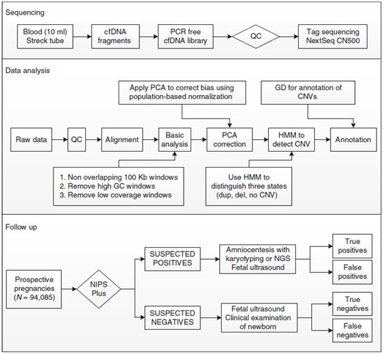 为了解决这个问题,最近中南大学邬玲仟教授团队与贝瑞基因合作设计并开发了一种名为NIPS-Plus的高级分析流程,利用比传统NIPS更高的测序深度,组合数据分析算法来额外调用与MMS相关的全基因组拷贝数变异(CNV)。使用NIPS-Plus前瞻性分析94,085例单胎妊娠,并报告其同时检测常见非整倍体和MMS的表现。