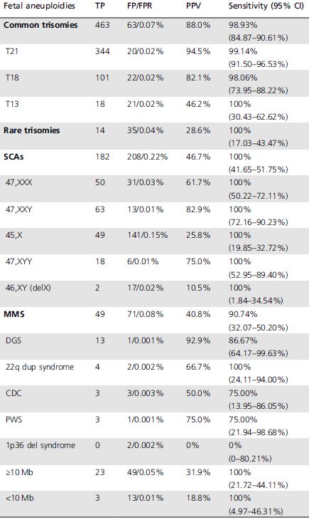 T21、T18、T13三体的阳性预测值(PPV)分别为95%,82%和46%。其他染色体的罕见三体或单体的阳性预测值(PPV)为29%。不同的性染色体阳性预测值(PPV)分别为45,X(26%)、47,XXY(83%)、47,XXX(62%)、47,XYY(75%)、46,XY(Xdel)(11%)。